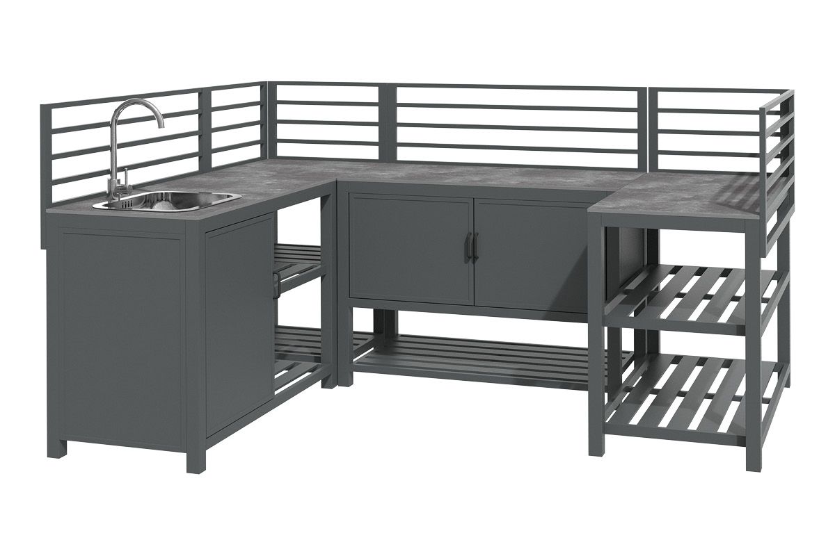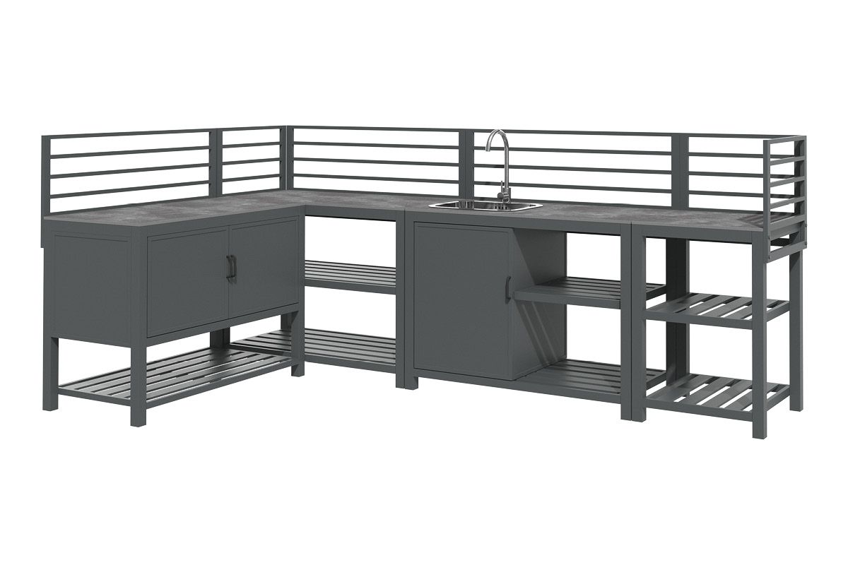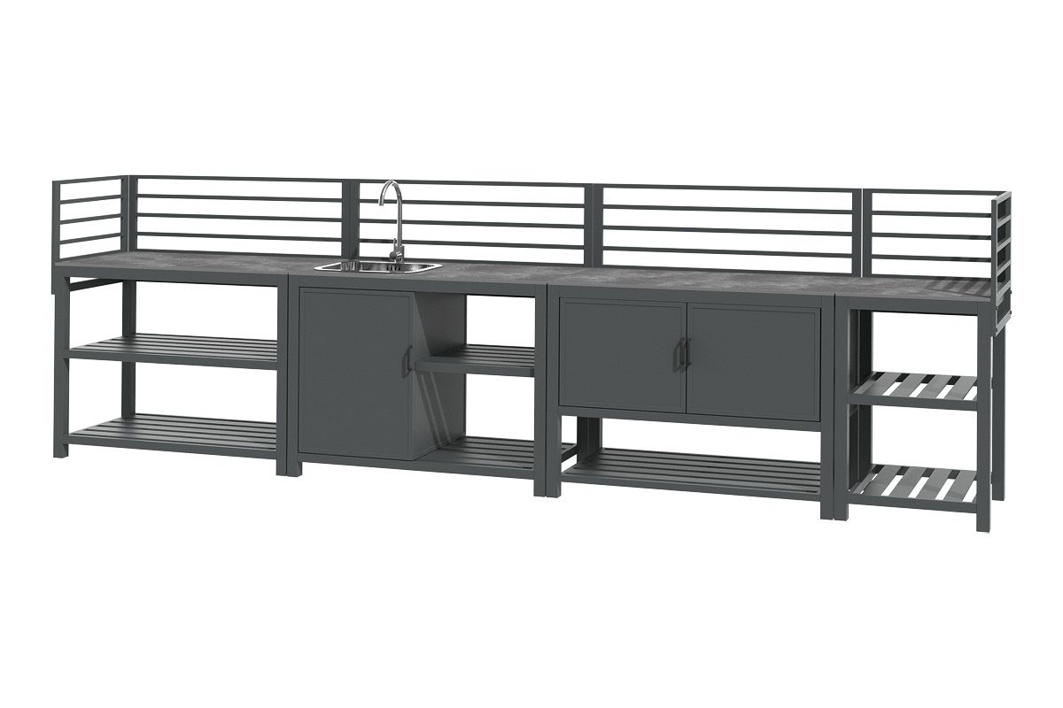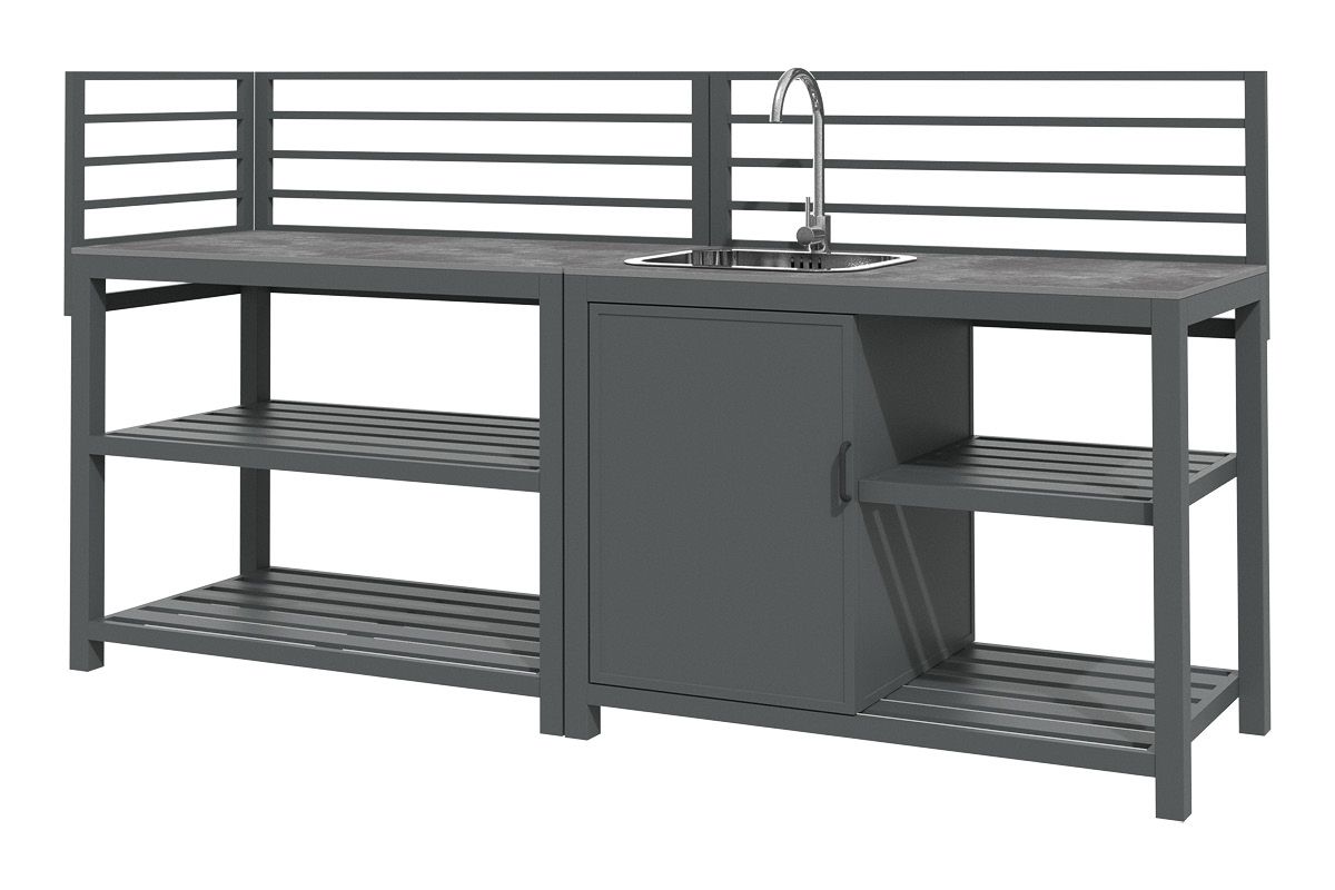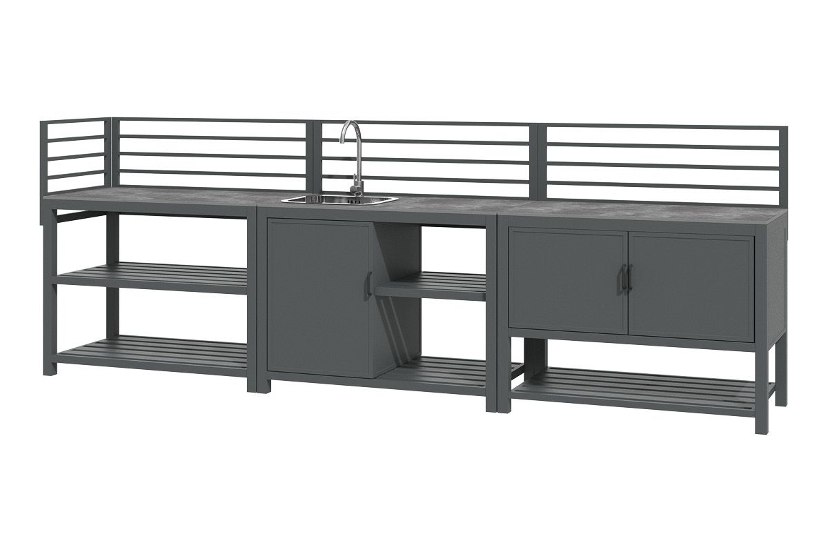 Aluminium-Outdoorküche in Anthrazit – so flexibel wie Ihr Sommer. Diese moderne Outdoorküche aus pulverbeschichtetem Aluminium in Anthrazit lässt sich perfekt an Ihre Wünsche anpassen. Vier verschiedene Elemente können ganz nach Bedarf miteinander kombiniert werden: ein Modul mit Korpus und Doppelflügeltüren zur geschützten Aufbewahrung, ein Modul mit Edelstahlspüle inklusive Armatur, sowie zwei Elemente mit offenen Ablageflächen in zwei unterschiedlichen Breiten. Die durchgehende Arbeitsfläche besteht aus Sinterstein – einem besonders robusten, kratzfesten und pflegeleichten Material, das nahezu keine Feuchtigkeit aufnimmt und sich ideal für den dauerhaften Einsatz im Außenbereich eignet. Die Rückwand besteht aus vier waagerechten Aluminium-Querstäben, an denen sich zusätzlich eine praktische Ablagefläche einhängen lässt – ideal für Gewürze, Gläser oder Grillzubehör. Mit einer Arbeitshöhe von ca. 90-91 cm (je nach Fußeinstellung) bietet die Küche ergonomischen Komfort im Außenbereich. Ob kompakte Lösung mit zwei Modulen oder großzügige Koch- und Grillzone mit mehreren Elementen – die Outdoorküche ist flexibel erweiterbar und passt sich jeder Terrasse und jedem Garten perfekt an. Robust, wetterbeständig und klar im Design wird sie zum Mittelpunkt Ihrer Outdoor-Gastronomie.