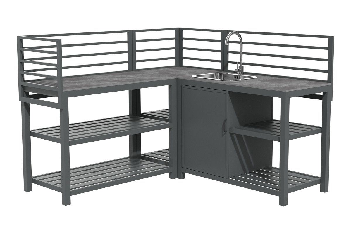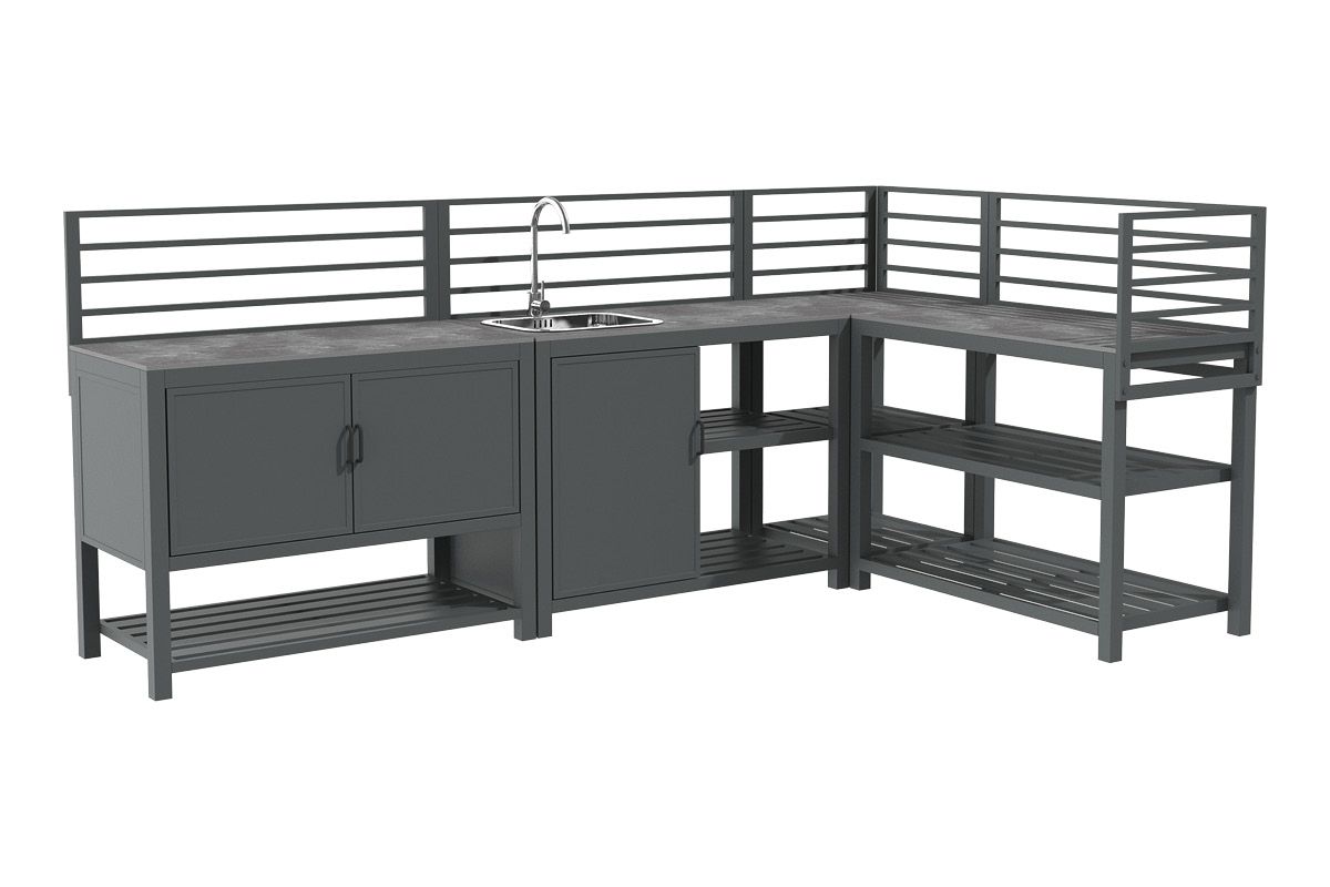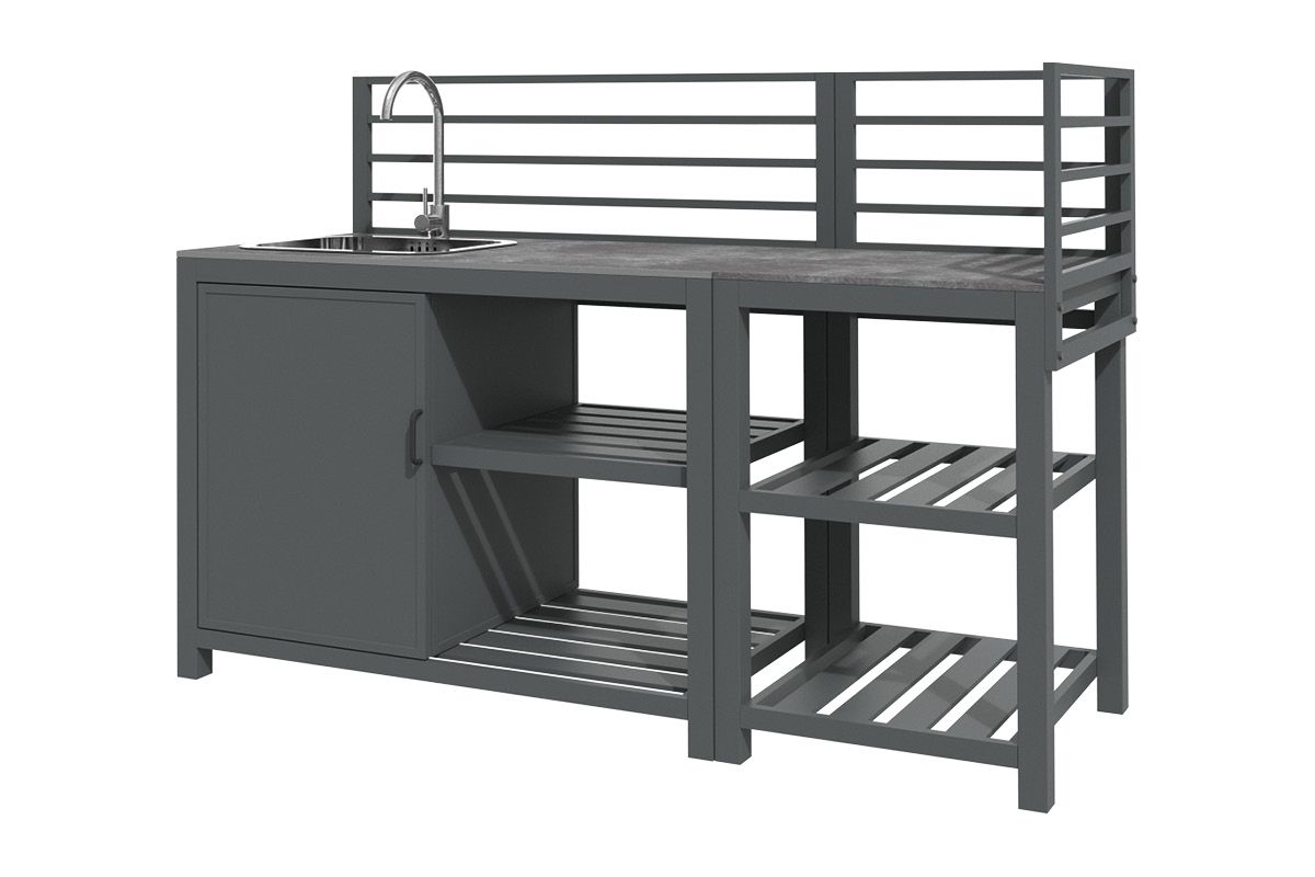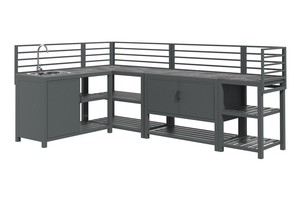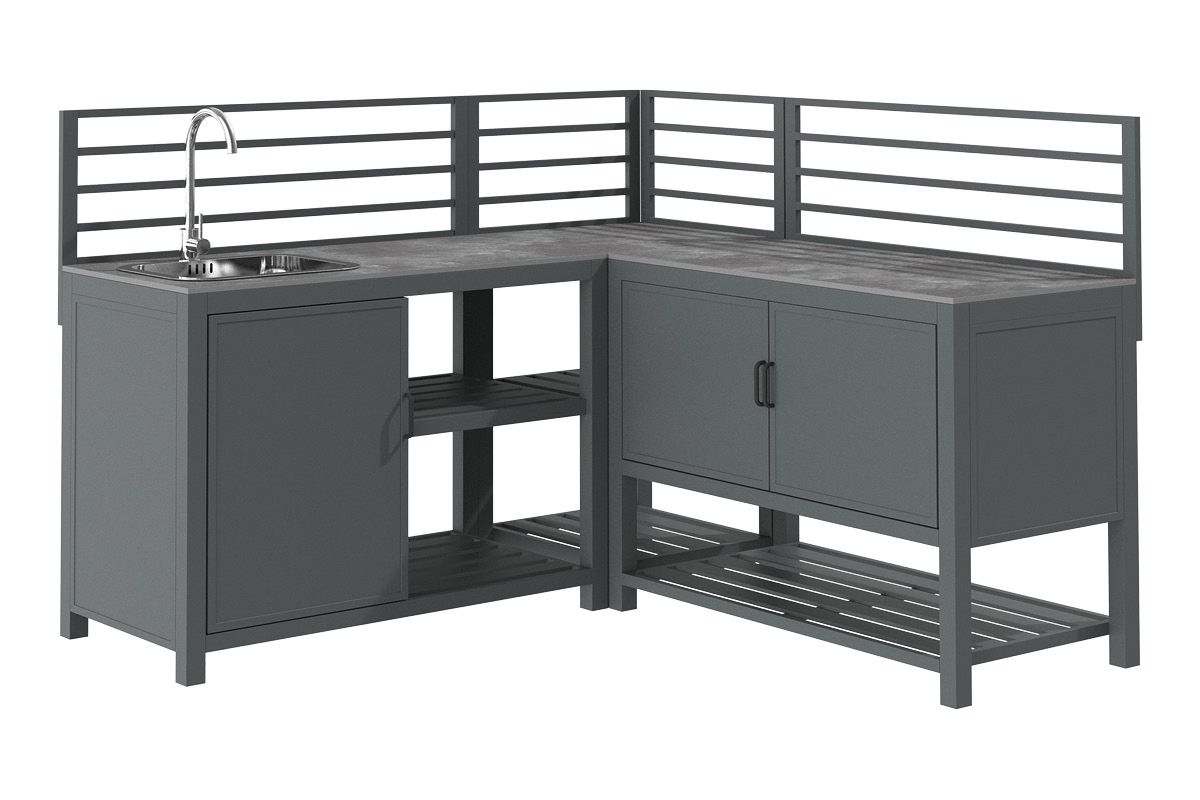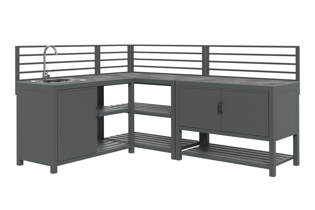 Aluminium-Outdoorküche in Anthrazit – so flexibel wie Ihr Sommer. Diese moderne Outdoorküche aus pulverbeschichtetem Aluminium in Anthrazit lässt sich perfekt an Ihre Wünsche anpassen. Vier verschiedene Elemente können ganz nach Bedarf miteinander kombiniert werden: ein Modul mit Korpus und Doppelflügeltüren zur geschützten Aufbewahrung, ein Modul mit Edelstahlspüle inklusive Armatur, sowie zwei Elemente mit offenen Ablageflächen in zwei unterschiedlichen Breiten. Die durchgehende Arbeitsfläche besteht aus Sinterstein – einem besonders robusten, kratzfesten und pflegeleichten Material, das nahezu keine Feuchtigkeit aufnimmt und sich ideal für den dauerhaften Einsatz im Außenbereich eignet. Die Rückwand besteht aus vier waagerechten Aluminium-Querstäben, an denen sich zusätzlich eine praktische Ablagefläche einhängen lässt – ideal für Gewürze, Gläser oder Grillzubehör. Mit einer Arbeitshöhe von ca. 90-91 cm (je nach Fußeinstellung) bietet die Küche ergonomischen Komfort im Außenbereich. Ob kompakte Lösung mit zwei Modulen oder großzügige Koch- und Grillzone mit mehreren Elementen – die Outdoorküche ist flexibel erweiterbar und passt sich jeder Terrasse und jedem Garten perfekt an. Robust, wetterbeständig und klar im Design wird sie zum Mittelpunkt Ihrer Outdoor-Gastronomie.