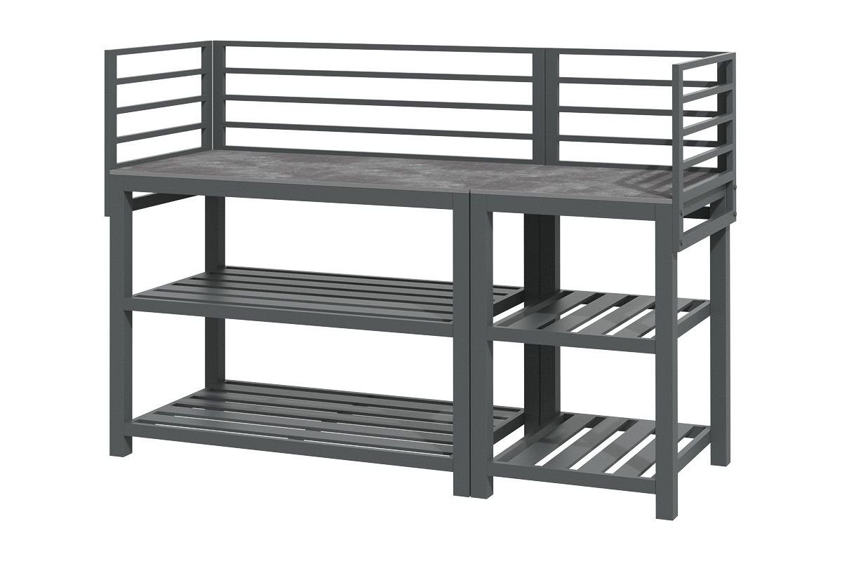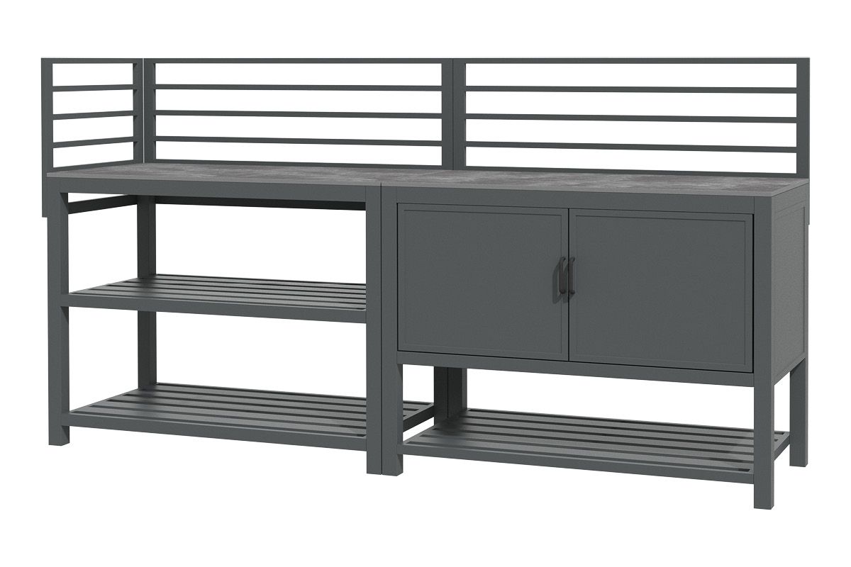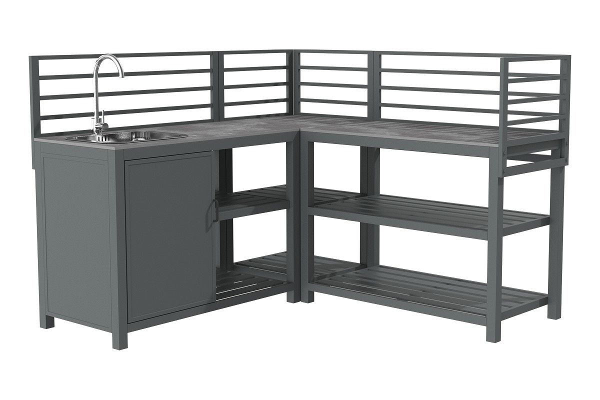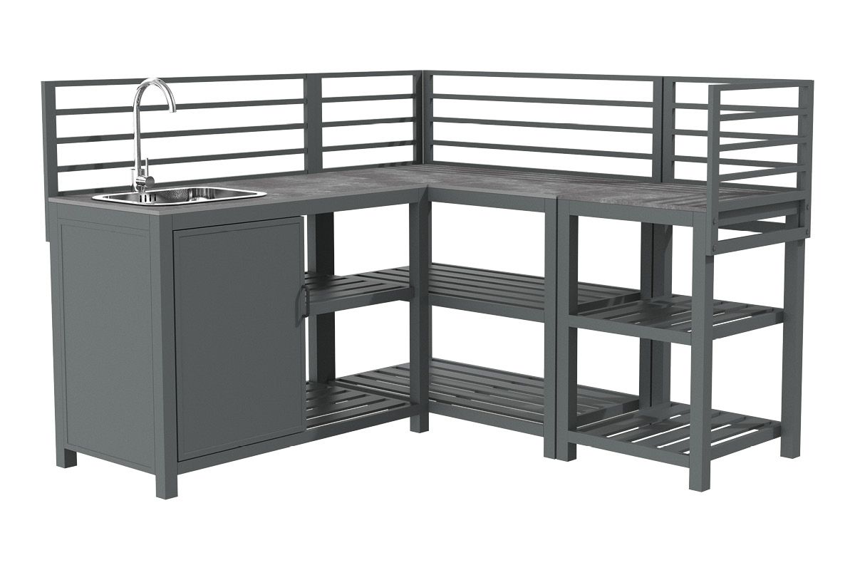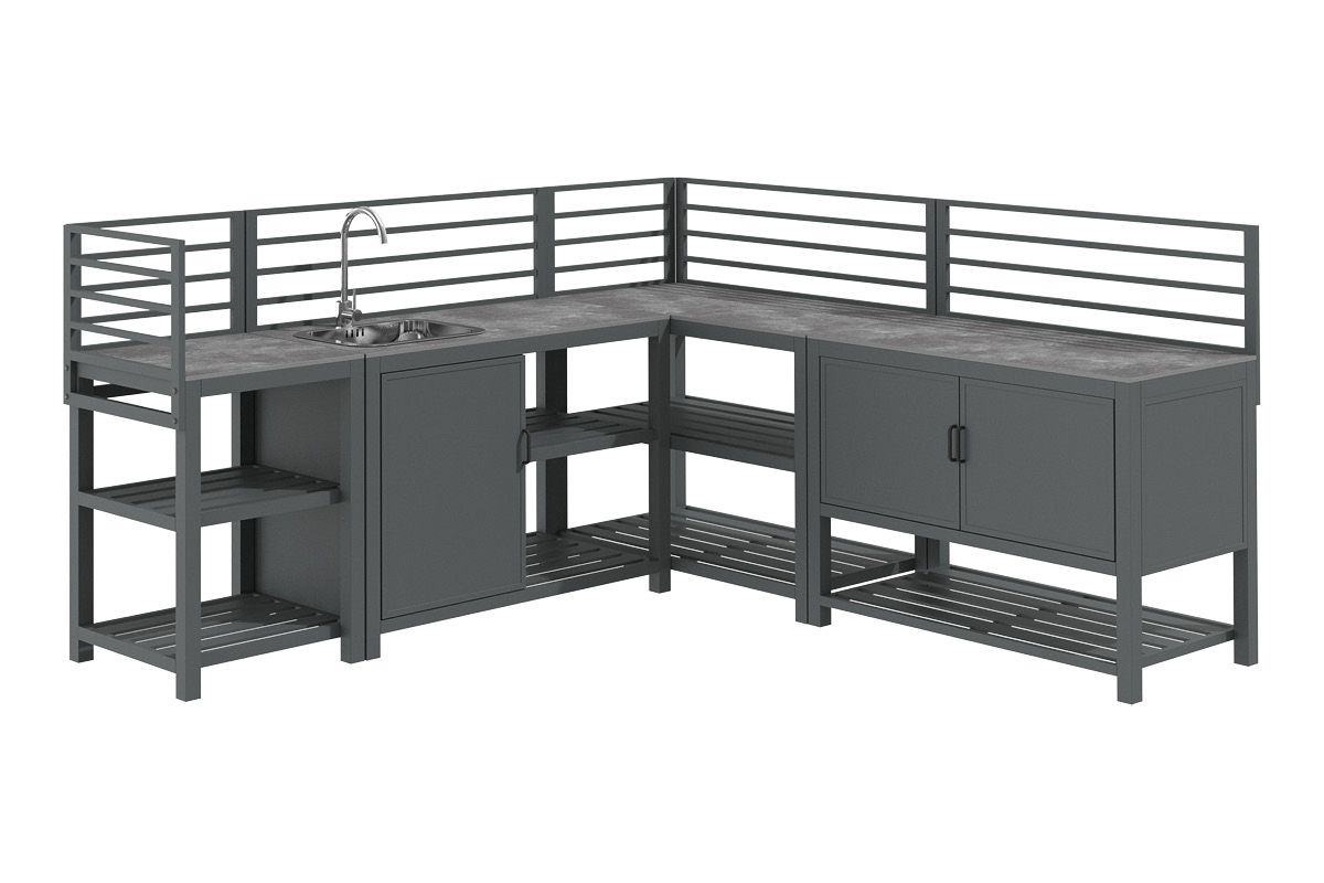 Aluminium-Outdoorküche in Anthrazit – so flexibel wie Ihr Sommer. Diese moderne Outdoorküche aus pulverbeschichtetem Aluminium in Anthrazit lässt sich perfekt an Ihre Wünsche anpassen. Vier verschiedene Elemente können ganz nach Bedarf miteinander kombiniert werden: ein Modul mit Korpus und Doppelflügeltüren zur geschützten Aufbewahrung, ein Modul mit Edelstahlspüle inklusive Armatur, sowie zwei Elemente mit offenen Ablageflächen in zwei unterschiedlichen Breiten. Die durchgehende Arbeitsfläche besteht aus Sinterstein – einem besonders robusten, kratzfesten und pflegeleichten Material, das nahezu keine Feuchtigkeit aufnimmt und sich ideal für den dauerhaften Einsatz im Außenbereich eignet. Die Rückwand besteht aus vier waagerechten Aluminium-Querstäben, an denen sich zusätzlich eine praktische Ablagefläche einhängen lässt – ideal für Gewürze, Gläser oder Grillzubehör. Mit einer Arbeitshöhe von ca. 90-91 cm (je nach Fußeinstellung) bietet die Küche ergonomischen Komfort im Außenbereich. Ob kompakte Lösung mit zwei Modulen oder großzügige Koch- und Grillzone mit mehreren Elementen – die Outdoorküche ist flexibel erweiterbar und passt sich jeder Terrasse und jedem Garten perfekt an. Robust, wetterbeständig und klar im Design wird sie zum Mittelpunkt Ihrer Outdoor-Gastronomie.