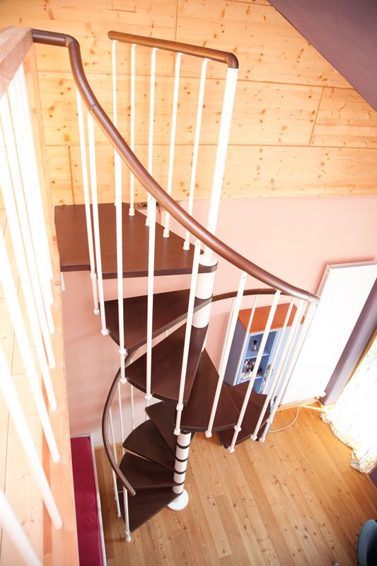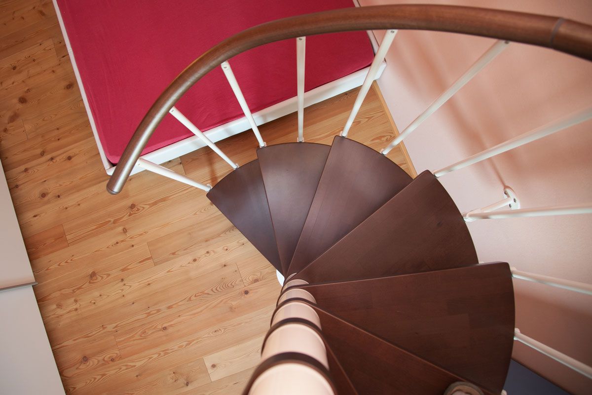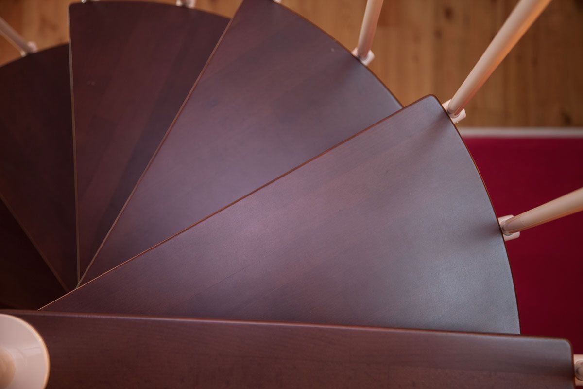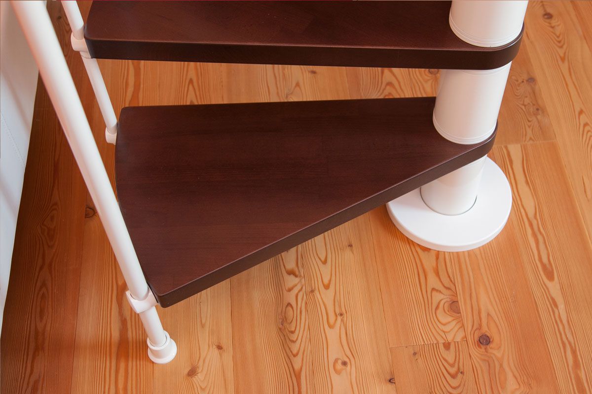 Spindeltreppe Innamincka - Holzart: Buche dunkel, Durchmesser: 128 cm, Metallfarbe: weiß, Abverkauf