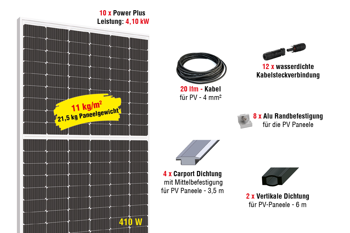Photvoltaik Dach POWER PLUS Komplett-Set für Carport-Erweiterungsset bestehend aus: