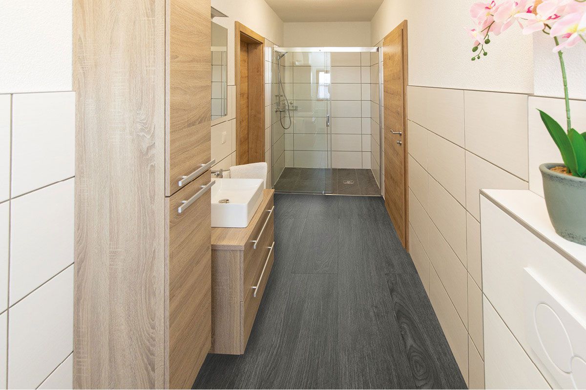 Der Vinylboden Loose-Lay ist ein selbstliegender, lose verlegbarer Bodenbelag der sich perfekt für Renovierungen, als auch für Neubauten eignet. Sie können den Loose-Lay Vinylboden, dank selbstliegenden Eigenschaften schnell und klebstofffrei verlegen. Der Vinylboden besitzt ein hohes Eigengewicht und wird bei der losen Verlegung Stoß-auf-Stoß auf den ebenen Untergrund gelegt. Die unkomplizierte Verlegung macht es möglich, einzelne Vinyl-Dielen des Designbodens bei Bedarf zu entnehmen und zu reinigen oder bei Beschädigungen zu tauschen. Es ist ausreichend den Boden am Rand auf den Untergrund zu kleben, optional kann er auch vollflächig verklebt werden. Bei vollflächiger Verklebung eignet sich dieser Boden auch perfekt für Badezimmer und Toiletten. Da der Vinylboden wärmer ist als Fliesen, erfreut er sich dort immer größerer Beliebtheit.