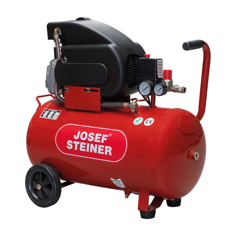 Der Josef Steiner Kompressor bietet mit seinen 50 Liter Kesselinhalt ausreichend Luftreserven für ein angenehmes Arbeiten. Die großen Räder sowie der Haltebügel ermöglichen einen einfachen Transport und der vibrationsgedämpfte Fuß garantiert einen sicheren Stand. Der Kompressor ist mit einer langlebigen, ölgeschmierten Pumpe für hohe Luftleistung ausgestattet. Der Ölstand ist mittels Anzeige einfach ablesbar. Das große Manometer sorgt für einen geregelten Kesseldruck. Das Ablassen des Kondensats aus dem Kessel per Entwässerungsschraube ermöglicht eine komfortable Wartung.